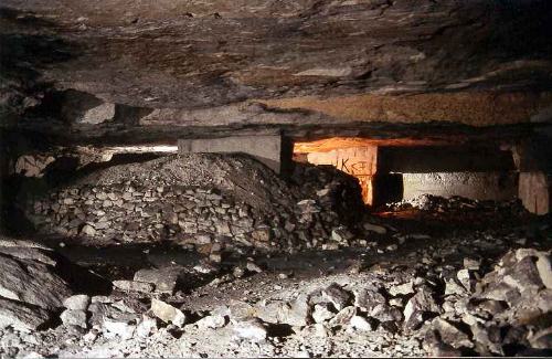 3.6 Nachkriegszeit bis heuteNach Kriegsende wird der Rüstungsbetrieb als Reparationsleistung demontiert. Anschließend werden die unterirdischen Anlagen durch die Alliierten gesprengt, jedoch ohne die Stollen zum Einsturz zu bringen (s. Abb. 5). Der Bruchbesitzer Theodor Rings ist über die Zerstörungen entsetzt und beschwert sich beim Oberbergamt: "Mache Ihnen hierdurch die Mitteilung, daß ein Sprengkommando der Militärregierung meinen Steinbruch sprengt". Allerdings ohne Erfolg. Er nimmt den Betrieb danach in bescheidenem Umfang wieder auf. Auch in anderen Gruben werden vereinzelt noch Steine abgebaut, doch der Ofenbau kommt nicht mehr richtig in Gang. Die letzten Steine werden von Rings in den 50er Jahren - vor allem für Reparaturen - gebrochen. Dann ist der Abbau von Steinen nach rund 600 Jahren beendet.