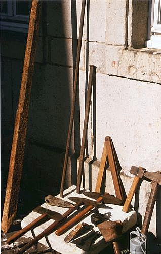 Abb. 15: Werkzeuge der Ofenbauer, v.l.n.r.: 1. Reihe: Brecheisen, Scheideisen, Schmiege, Hämmer. 2. Reihe: Hebel, Flächt, Zweispitze, Keile, Frosch (Lampe), Scharriereisen, Klöppel, Karbidlampe. Bestand des Siebengebirgsmuseums Königswinter.