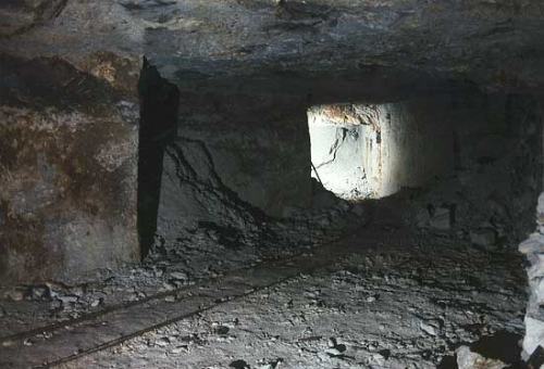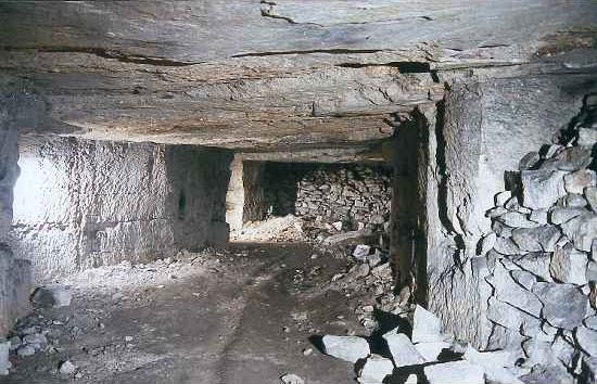 Abb. 6: Grube mit Pfeilerbau. Der anfallende Schutt wurde hinter Trockenmauern gestapelt. Deckenhöhe ca. 2,5 Meter.
