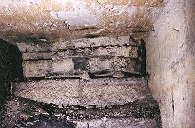 Im "Normalfall" wurden mindestens drei übereinanderliegende Blocklagen abgebaut. Dabei arbeitete man sich stufenartig vorwärts, um so immer bequem an die Arbeitsstellen in verschiedener Höhe heranzukommen (s. Abb. 11). Auch konnten so mehrere Leute gleichzeitig beschäftigt werden. Je nach Lage der Fratzbänke wurden Gänge mit 3 bis 4 Meter, oft 5 - 6 Meter Höhe gebrochen. In einem besonders günstigen Bereich entstanden Hallen von 10 bis 15 Metern Höhe. In zahlreichen Brüchen finden sich mit Kohlestiften angebrachte Strichlisten an den Wänden, die wohl in Zusammenhang mit den gewonnenen Steinen zu sehen sind. Der reichlich anfallende Schutt wurde nach Möglichkeit nicht aus der Grube herausgeschafft, sondern hinter Trockenmauern oft bis knapp unter die Decke gestapelt. Der Boden ist meist mit ein bis zwei Metern Schutt bedeckt.