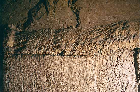 Abb. 7: Schlagspuren, die beim seitlichen Fuhren der Blöcke entstehen. Die geschwungenen Spuren sind von der Zweispitz. Die kurzen, geraden von langen Meißeln, die mit zunehmender Tiefe benutzt wurden. Darunter die gleichmäßigen Spuren vom "Fuhren" der eigentlichen Blöcke.