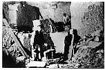 Abb. 11: Werkplatz unter Tage. Unten ein Ofenbauer beim Zurichten von Gewölbesteinen. Oben Abbau von Böcken. Dabei arbeitete sich man in Stufen vorwärts.